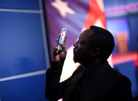 Musician Will.i.am takes a photograph with his phone before the presidential debate at the University of Denver, Oct. 3. The first debate between Mitt Romney and Barack Obama takes place tonight, moderated by PBS's Jim Lehrer and focuses on domestic issues.