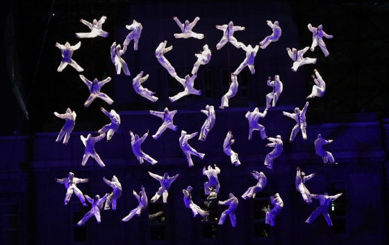 South Korean performers suspend in midair during a performance, called "Aphrodite" by Spanish theater company La Fura Dels Baus, in Seoul, South Korea, Oct. 5, 2012. The performance is part of the Hi Seoul Festival running from Oct. 1 through Oct. 7.