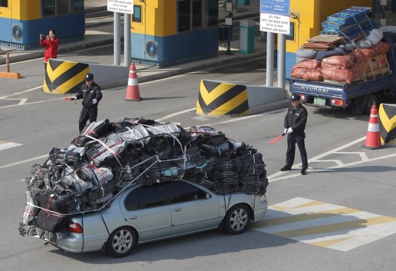 Customs officers stand guard as a South Korean company vehicle carrying products made in the Kaesong Industrial Complex in North Korea, arrives Saturday, April 27, 2013, at the customs, immigration and quarantine office just south of the demilitarized zone separating North from South Korea in Paju, north of Seoul.