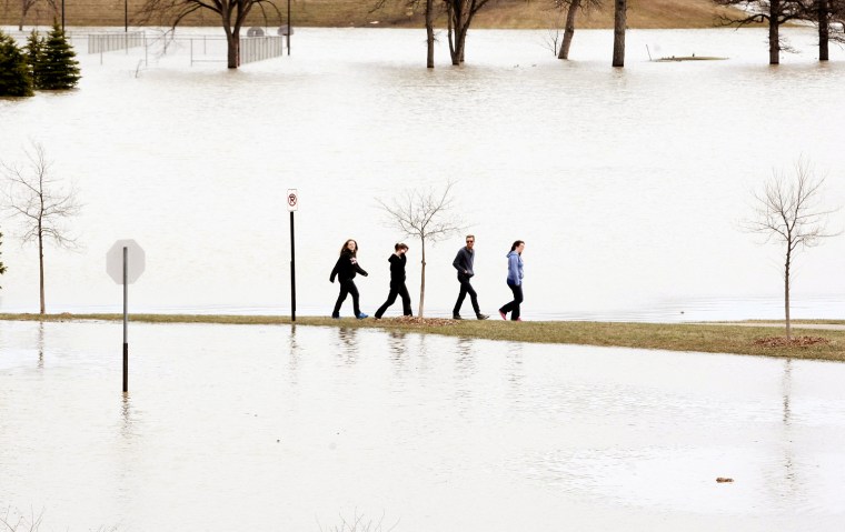 People walk on a narrow strip of land between a flooded Woodlawn Park, background, and the rising Red River, foreground, April 28, in Moorhead, N.D.