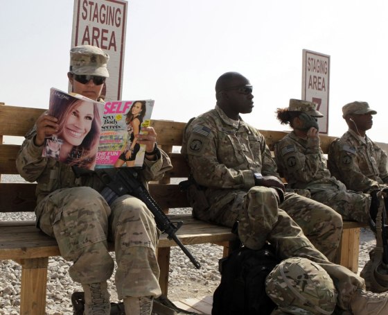 U.S. Army soldier SSG Norma Gonzales of 426 Civil Affairs Battalion reads a magazine next to fellow soldiers while waiting to be ferried by a helicopter to different U.S. military bases in Kandahar, southern Afghanistan on Thursday.