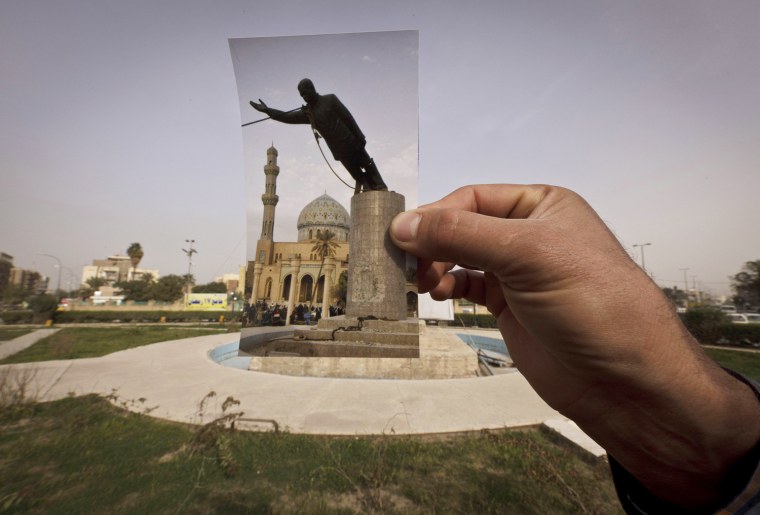 This Wednesday, March 13, 2013, photo shows a general view of Firdous Square at the site of an Associated Press photograph taken by Jerome Delay as the statue of Saddam Hussein was pulled down by U.S. forces and Iraqis on April 9, 2003. Ten years ago on live television, U.S. Marines memorably hauled down a Soviet-style statue of Saddam, symbolically ending his rule. Today, that pedestal in central Baghdad stands empty. Bent iron beams sprout from the top, and posters of anti-American Shiite cleric Muqtada al-Sadr in military fatigues are pasted on the sides.
