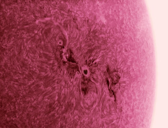 Friedman specializes in solar photography that keys in on hydrogen-alpha wavelengths, a part of the spectrum that is particularly well-suited to show variations in the sun's seething surface. The sunspots are magnetically disturbed whorls of plasma that are prone to send out flares and eruptions of electrically charged particles.