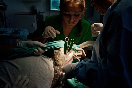 Veterinarians operate on a Galapagos green turtle (Chelonia mydas agassisi), an endangered species, to extract a fishhook from its esophagus in San Salvador, El Salvador, on Friday. Surgery was also performed on another Galapagos green turtle with a head injury. Both turtles were rescued by volunteers at La Costa del Sol beach, 45 miles south of San Salvador, after spawning.
