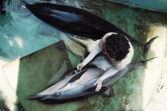 A veterinarian from the Zoological Foundation of El Salvador, FUNZEL, uses a stethoscope on a female dolphin in San Diego on October 25, 2012.