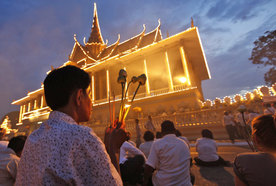 Mourners pray for former Cambodian King Norodom Sihanouk in front of the Royal Palace in Phnom Penh, Cambodia, Oct. 22. Sihanouk, once an absolute ruler who freed Cambodia from colonialism before becoming a tragic pawn through decades of turmoil, died on Oct. 15 in a Beijing hospital. He was 89. His body will lie in state for the next three months before a traditional cremation ceremony is held.