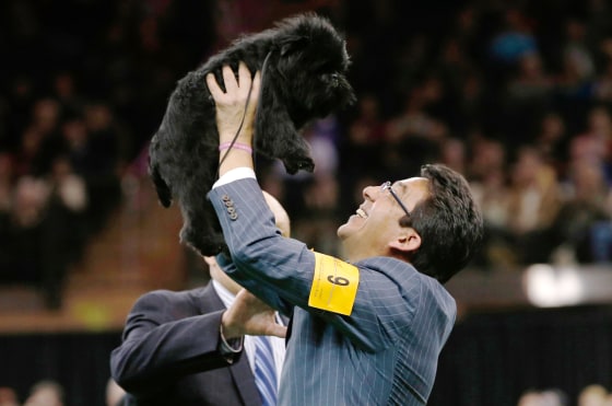 Handler Ernesto Lara holds up Banana Joe, an Affenpinscher, who won the Best in Show at the 137th Westminster Kennel Club Dog Show at Madison Square Garden in New York, February 12, 2013. Read the full story.