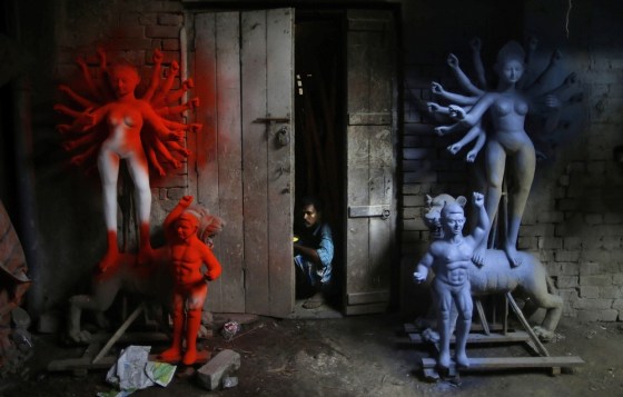 A laborer looks out of a workshop that prepares idols of goddess Durga in Kolkata, India, on October 16, 2012. Durga Puja, the festival dedicated to the worship of Durga begins on October 20.