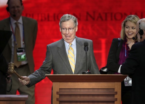 Senate Minority Leader Mitch McConnell of Ky. reacts to the loud amplified sound from banging the gavel as he checks out the stage at the Republican National Convention inside the Tampa Bay Times Forum, Monday, Aug. 27, in Tampa, Fla.