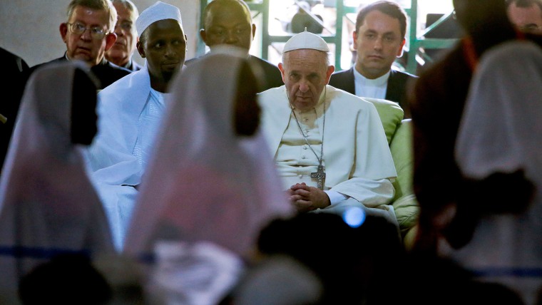 Pontiff ventured into volatile Muslim neighborhood of capital, Bangui, to visit city's main mosque and insisted religion can never justify violen