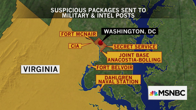 Officials have said packages turned up at the CIA's mail-sorting facility, a White House mail-sorting facility in suburban Washington, a Navy facility in Dahlgren, Virginia, and two facilities at Fort Belvoir, Virginia — the National Geospatial-Intelligence Agency and another defense university.