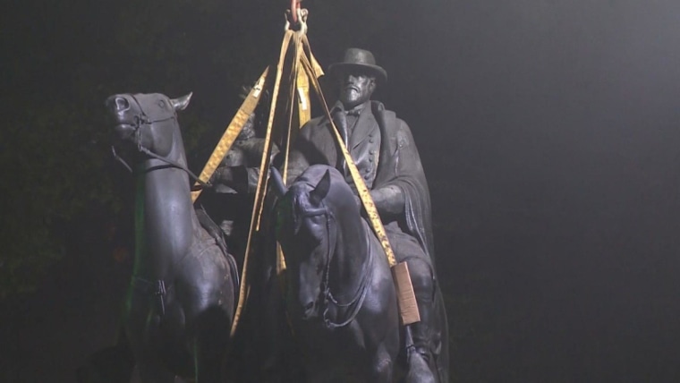 About a half-hour later, crews began removing a monument of Confederate generals Lee and Thomas. J. "Stonewall" Jackson, WBAL reported. Given the monument's size, that took about two hours, Pugh said.