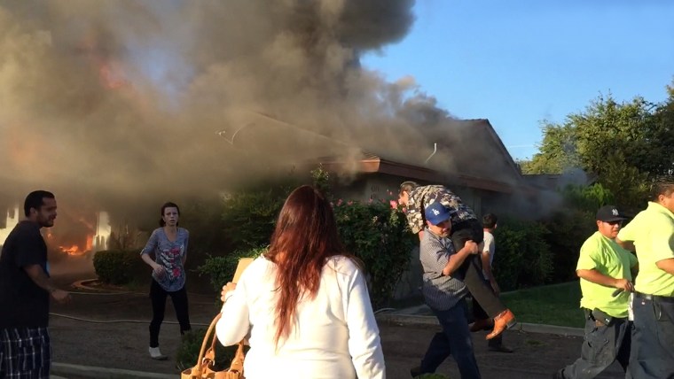 Video shows one man carrying another of his shoulder as he flees a house engulfed in smoke and flames in Fresno, Calif.