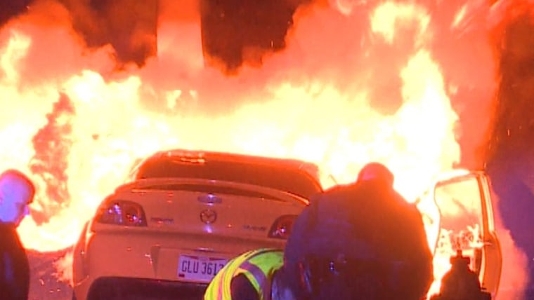 Officers David Kelley and Brian Crites saw a man's yellow Mazda hit a railroad overpass support beam and burst into flames Thursday morning around 2:15 a.m. local time, NBC affiliate WKYC reported. The officers placed a desperate call for assistance from firefighters.