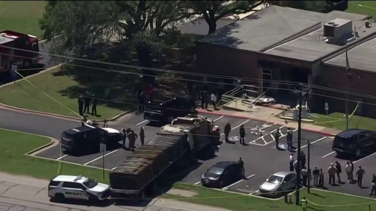 Aerial video from NBC News affiliate KPRC of Houston shows a large semi in the parking lot of the office, aimed at the building and partially backed out into the street.