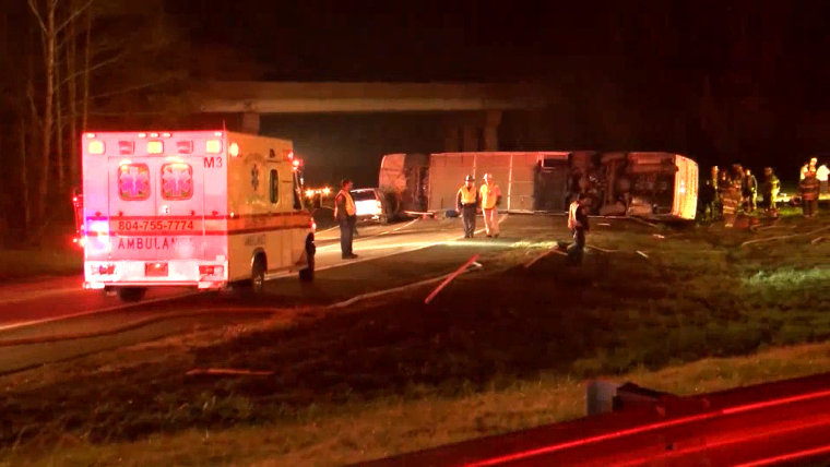 Police said the overturned bus was carrying students from Virginia Tech, Radford University and the University of Virginia.
