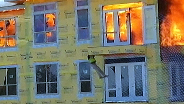 Watch the amazing rescue of a construction worker from the balcony of a burning Houston apartment building seconds before the ceiling collapsed.