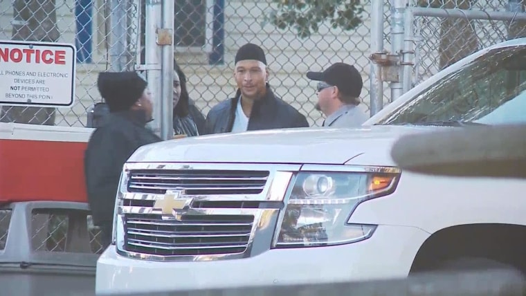 The one-time Carolina Panthers player smiled just before getting into a white Chevrolet Tahoe and was driven away.