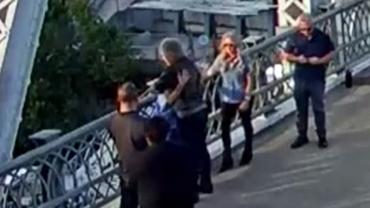Police released security video of the interaction, in which a woman in blue holds on to the railing while she stands on the ledge. Other people pass her, and farther down the bridge, Bon Jovi's team appears to be setting up for a video or photo shoot.