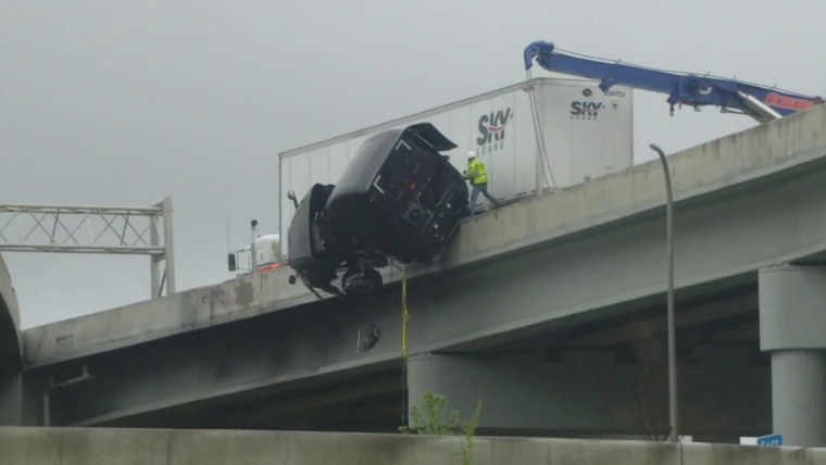 The cab of a crashed tractor-trailer precariously dangled from an overpass on I-65 — with the driver inside.