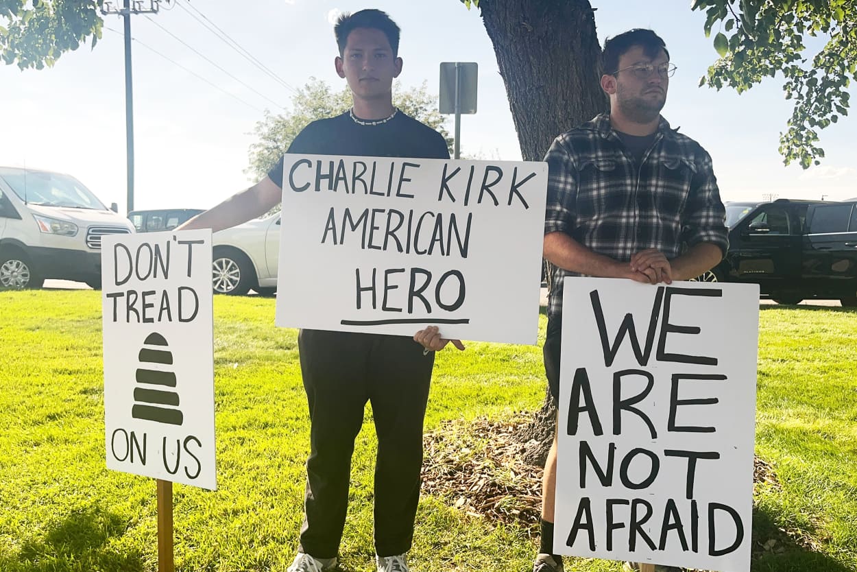 Two cousins stood near an entrance to the Utah Valley University campus today with signs in support of Kirk amid the manhunt for his killer.
