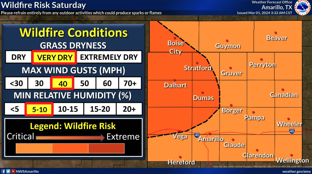 Critical fire weather conditions are expected to return from midday tomorrow and once again after sunrise Sunday, the National Weather Service office in Amarillo said. This includes very dry, hot winds of up to 40 mph.