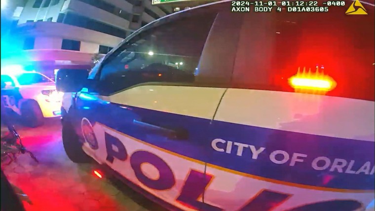 Surveillance video released by Orlando police showed the suspect in a yellow shirt walking in the crowd. He appeared to raise his right hand and open fire, according to the video. An officer knocked down the suspect and three others ran to help arrest him.