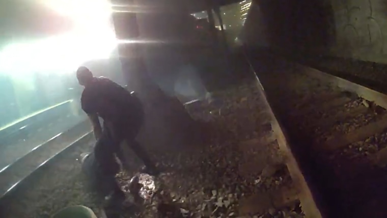 Seconds later the man slips and falls 25 feet onto the tracks, sustaining serious injuries. Two officers go onto the tracks as an oncoming train sounds its horn, pulling him to safety just as it passes.