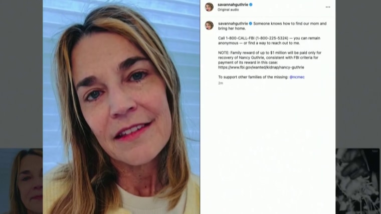 "Someone knows how to find our mom and bring her home," Savannah Guthrie wrote in a caption accompanying a video published on Instagram just before 9 a.m. Tuesday.