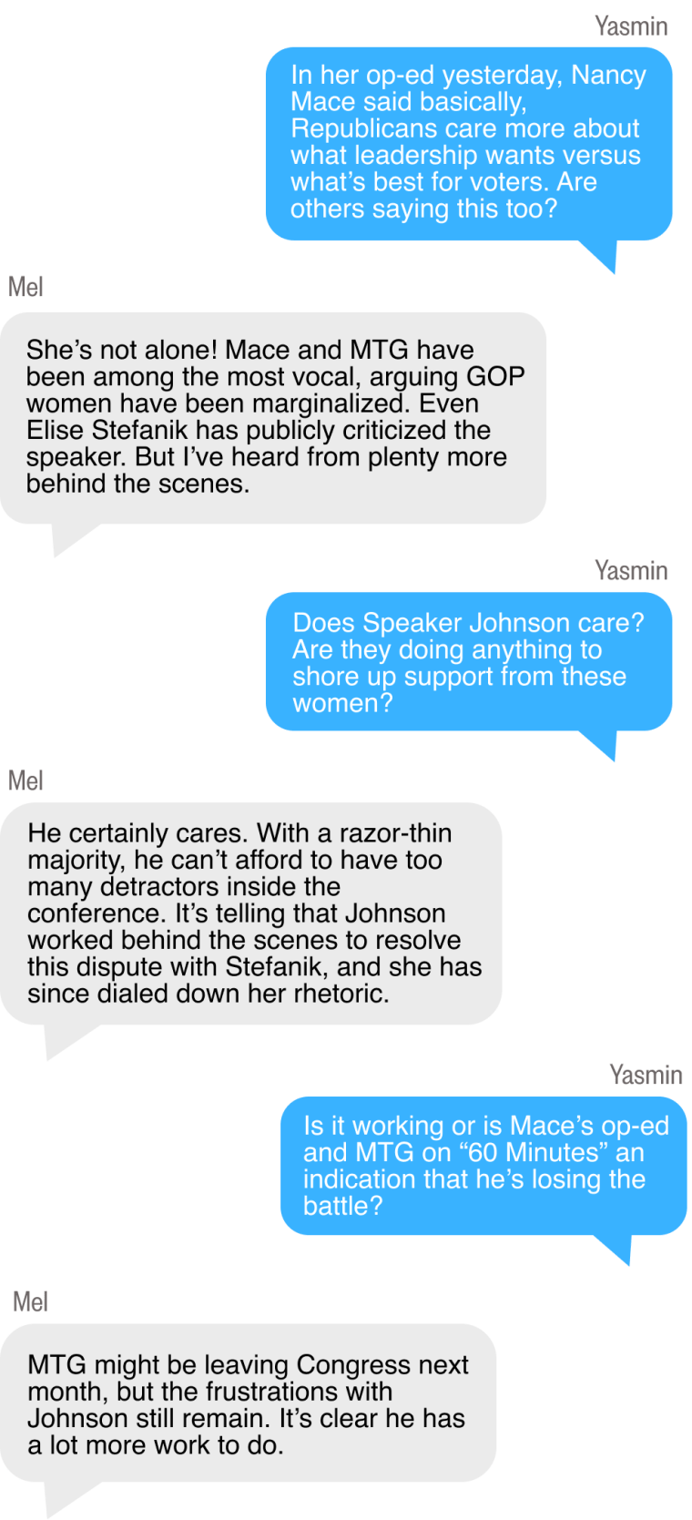 Rep. Marjorie Taylor Greene of Georgia sent shock waves when she announced she would resign to Congress over her frustrations with party leaders and the president. South Carolina Rep. Nancy Mace penned an essay in The New York Times yesterday about women in the party being cast aside by male leaders for decades. For more on this growing call from within the House, I turned to Capitol Hill correspondent Mel Zanona.