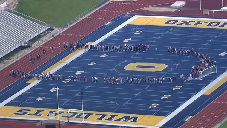 When the Oxford High School students emerged, they were met with applause from many parents parked across the street, who kept clapping as they marched across the campus to the football field. There, the students formed a big "U" in memory of the children and the teachers killed Tuesday in Uvalde, Texas.
