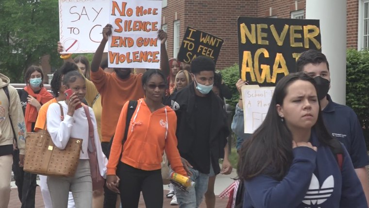 "Unfortunately, this has not been the first time we students have been forced to act," said senior Roan Thibault, 17, who remembered being in middle school the first time he took part in a walkout to demand more gun control after the 2018 massacre at Marjory Stoneman Douglas High School in Parkland, Florida.