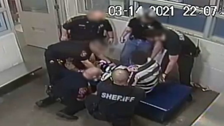 The March 14 footage contains no sound and was given to NBC News with the faces blurred. The sheriff's office said in an email that the faces were "intentionally blurred" and the lack of sound is because the jail's camera system does not record audio.