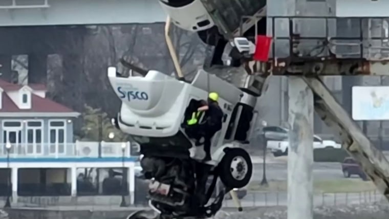 LOUISVILLE, Ky. — The driver of a semi-truck was pulled to safety Friday by firefighters following a crash that left the vehicle dangling over a bridge across the Ohio River.