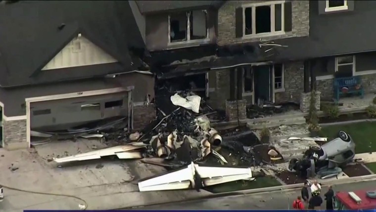 Photos of the wreckage showed the white plane charred and in pieces in the front yard nearby an overturned and crushed car. Most of the upscale house was still intact, but heavily burned in the front.