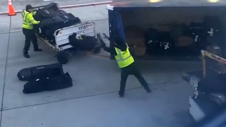 In the video, a handler throws several golf club bags onto the tarmac, where they roll around before another handler loads them onto a cart.