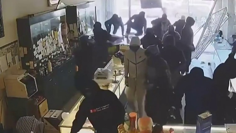 The video, verified by NBC News, shows a Ford Explorer SUV smashing into the storefront before more than a dozen people in dark hoodies and masks rush in with picks and other tools to smash display cases and grab loot.