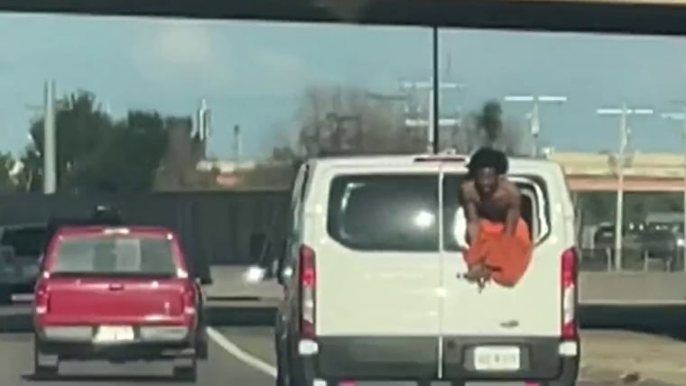 Cellphone video shows an inmate hanging out of the back window of a state prison transport van moving at freeway speeds in Oklahoma City last week.