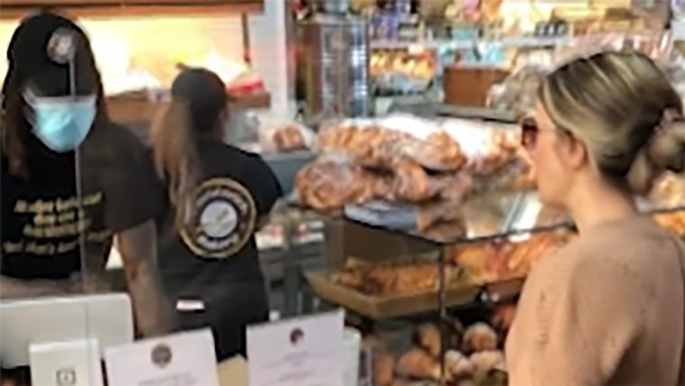 The woman, who has not been identified, was attempting to order from Davidovich Bakery inside the Essex Market food hall on the Lower East Side, according to NBC New York, which reported the incident took place Sunday. She was pushing a child in a stroller and appeared to have other children with her.