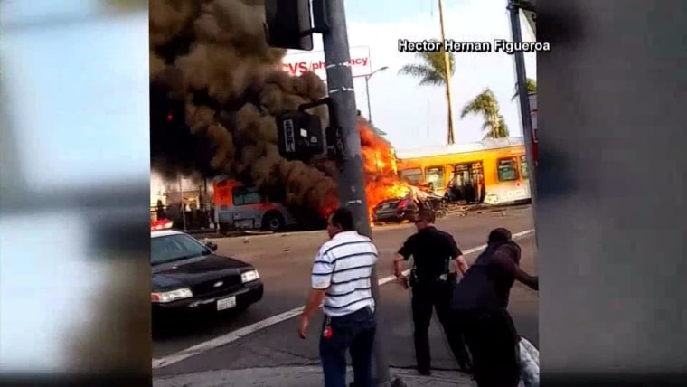 Two LAPD officers and a good Samaritan rushed into action after a chain reaction crash ignited a fire on a street in south Los Angeles.