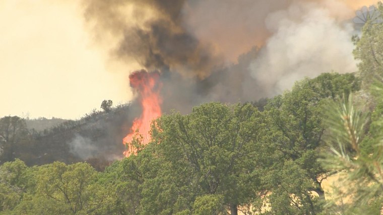 The flames were chewing through 1.5 square miles of rugged terrain in the hills outside of the tiny town of Guinda, California Department of Forestry and Fire Protection spokesman Gabe Lauderbale said.