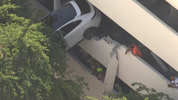 Aerial video from NBC South Florida's helicopter showed the white SUV over the edge of the garage and against a tree.