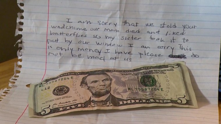 A woman in Lakewood, Washington, is hoping to find the boy who left money and a note apologizing for stealing a wind chime.