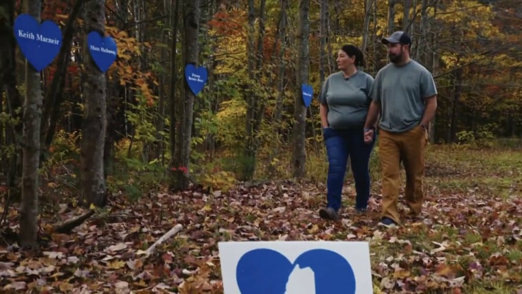 Like Walker, the Herlings are remembering those killed as a reminder of how acutely lives have been altered. The names of all 18 victims — one as young as 14 and others in their 70s — are written on the walls of their home; outside, the names line their property with blue hearts signifying Lewiston.