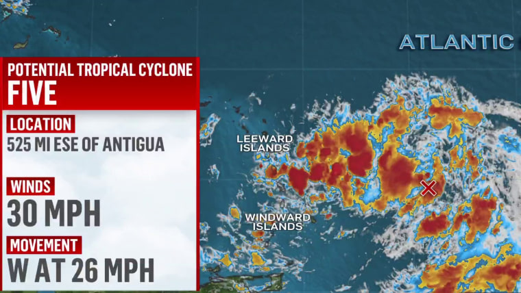 Potential Tropical Cyclone Five was taking shape 645 miles east-southeast of Antigua and was headed west-northwest at 25 mph, the National Hurricane Center said in a 5 a.m. update. Multiple Caribbean islands, including the U.S. Virgin Islands, are in its probable path.