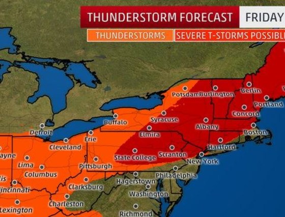 The intense heat was expected to bring strong to severe thunderstorms, with damaging wind gusts and large hail, to major Northeast cities Friday and Friday evening, including the I-95 corridor, before the storms shift back to the Upper Midwest for the weekend, according to the Weather Channel.