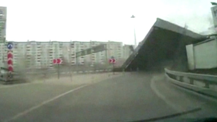 Windy conditions rip the facing off of a building and knock down trees in Moscow, Russia, on Monday. No injuries have been reported.