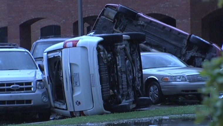 The aftermath of a tornado's direct hit to Louisville, Mississippi can be seen in overturned cars and uprooted trees.