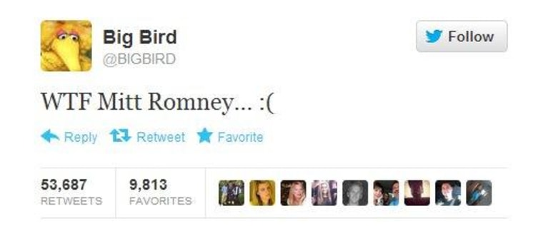 Who says Governor Mitt Romney doesn't talk specifics? It may have ruffled some feathers, but last night Romney offered some straight talk about how he plans reduce the deficit -- namely, cutting the federal subsidy for PBS. You may wonder why he only felt compelled to give this one, single example of a program he would eliminate, but as Politico noted, PBS funding accounted for a whopping .00014% of the federal budget in 2010. Romney followed up that comment by saying, "I love Big Bird" (see above, a parody account for the Sesame Street resident didn't take his intentions lightly).