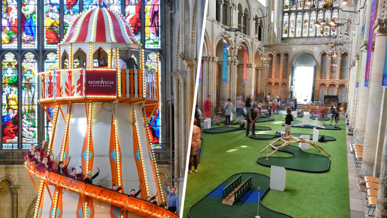 NORWICH, United Kingdom — When a place of worship has stood for almost a millennium, it would be easy to be skeptical about claims that it now includes a never-before-seen attraction. The huge carnival slide parked in the nave of Norwich’s ancient cathedral looks like it falls into that category.